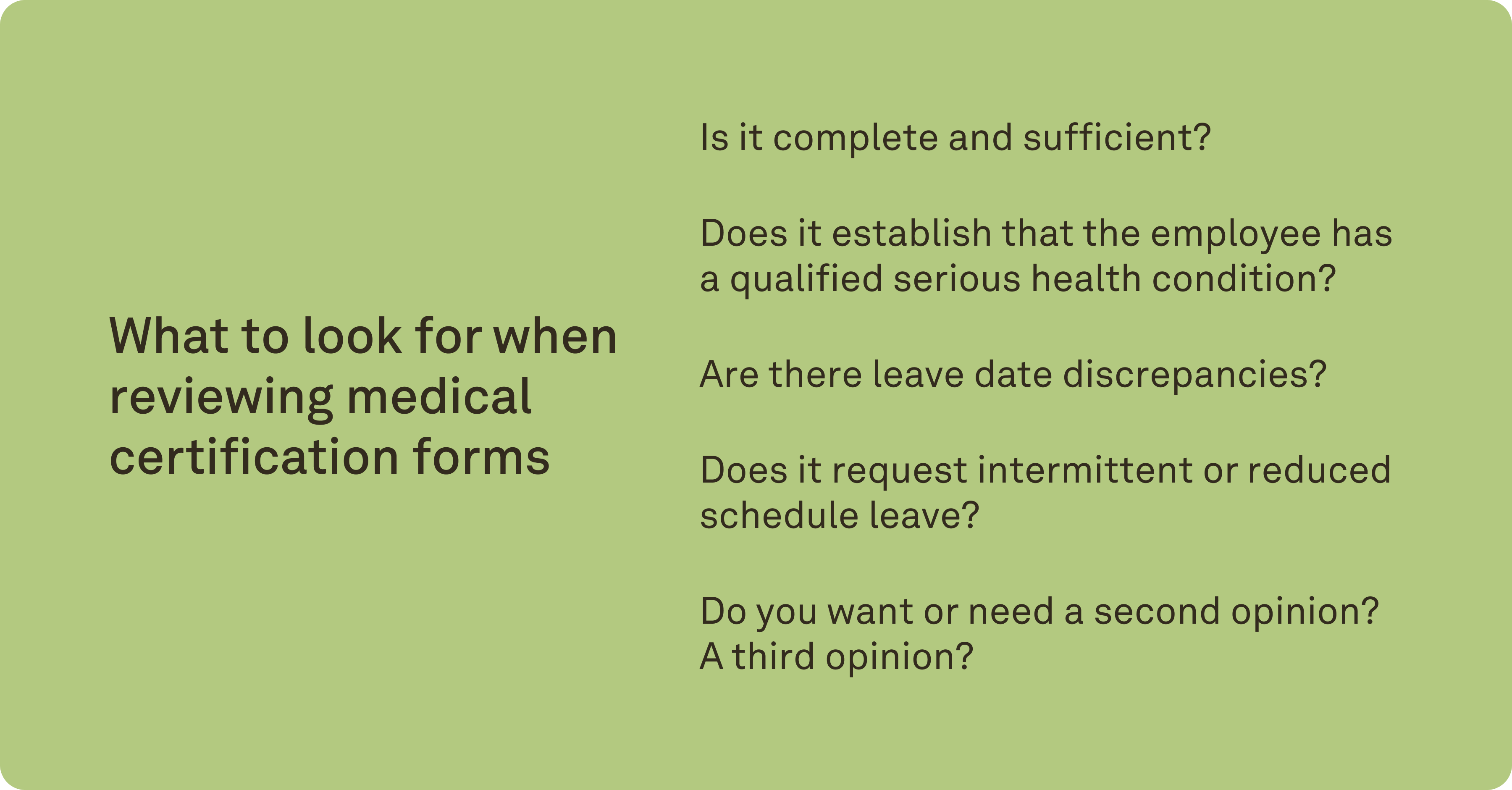 So, your organization has decided to require medical certification forms, and doesn’t automatically approve a form upon submission… What information are you actually looking for on the forms?